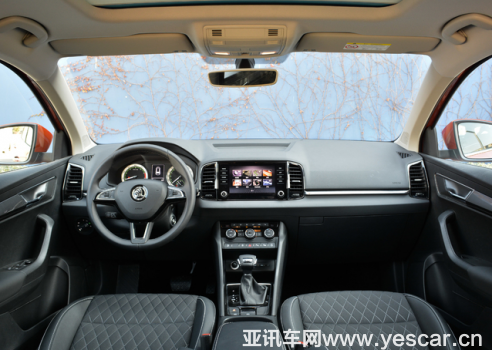 上汽斯柯达柯珞克的内饰设计极具个性,简约而又充满灵性的线条勾勒出了硬朗的风格,上扬的中控台设计使驾乘者的坐姿视野更高,为车内营造出了宽敞大气的感觉。出风口与中控屏衔接在一起的设计看起来比柯迪亚克更为高级。此外,中控台顶部采用了大面积的软性搪塑材质进行覆盖,材质皮面的仿皮纹理处理也增加了质感,不管是从视觉上还是触觉上,你都不会感到丝毫的廉价感。